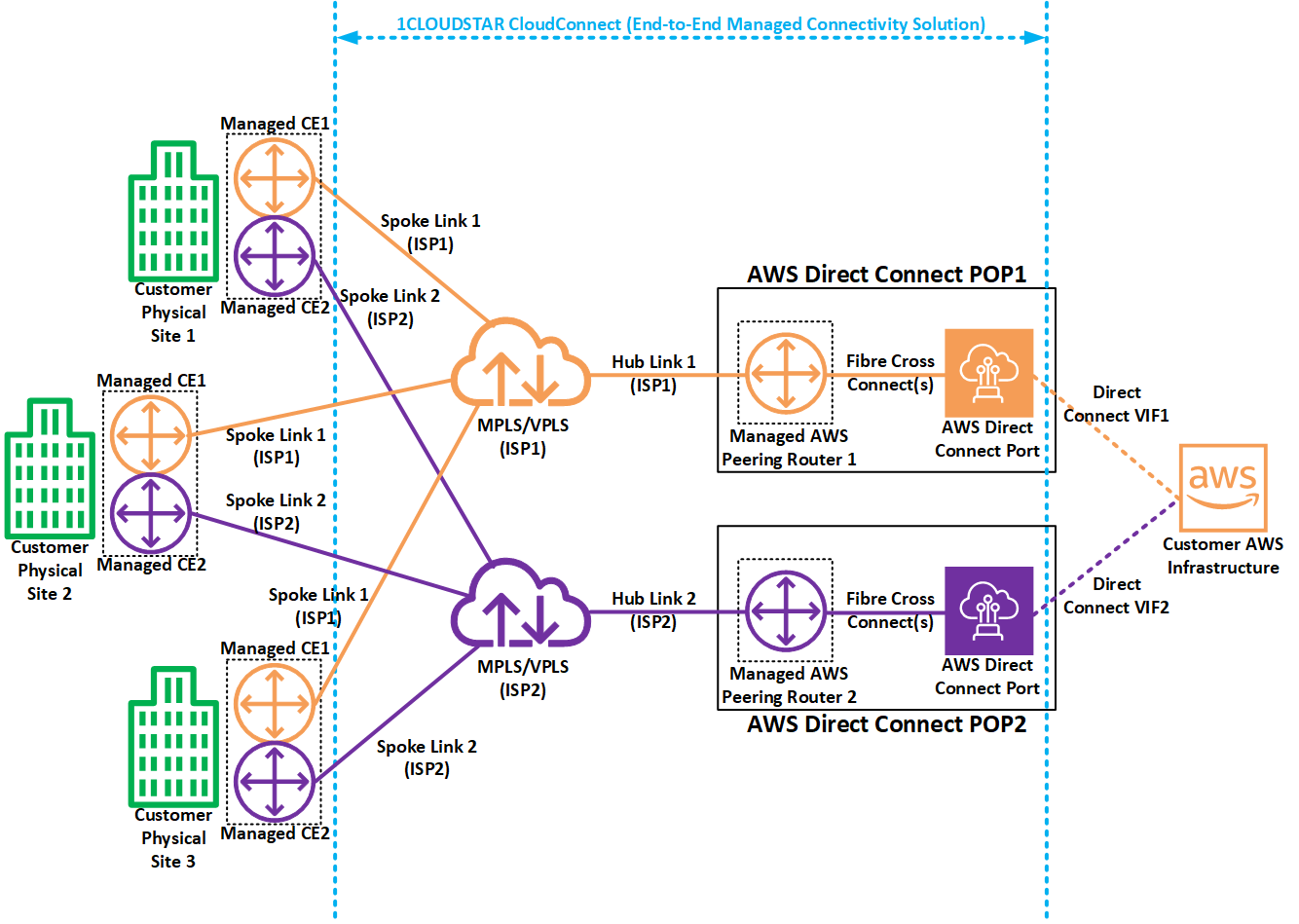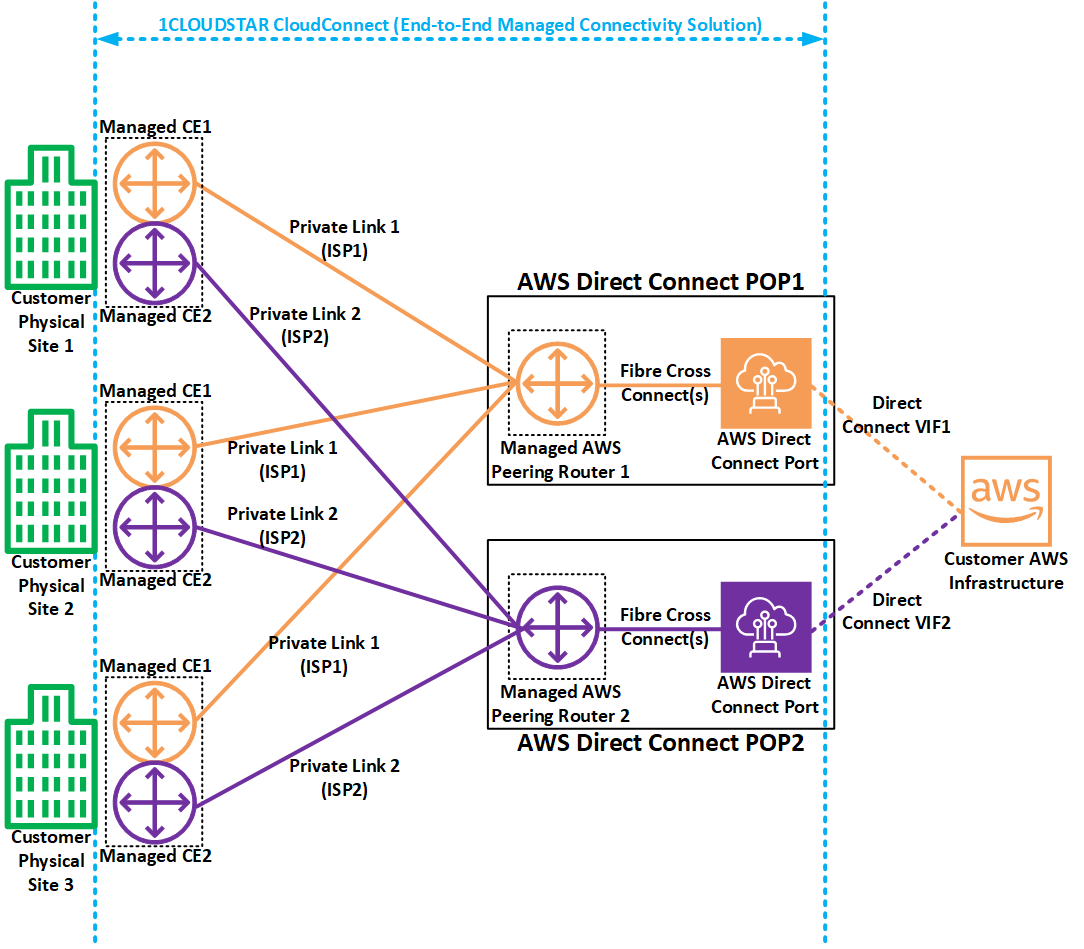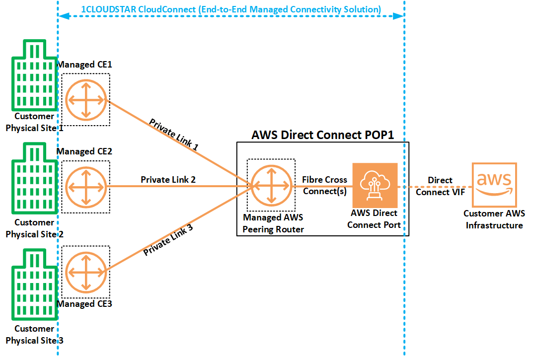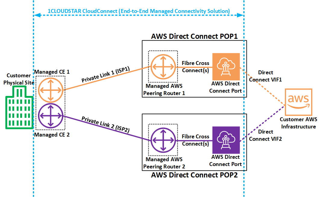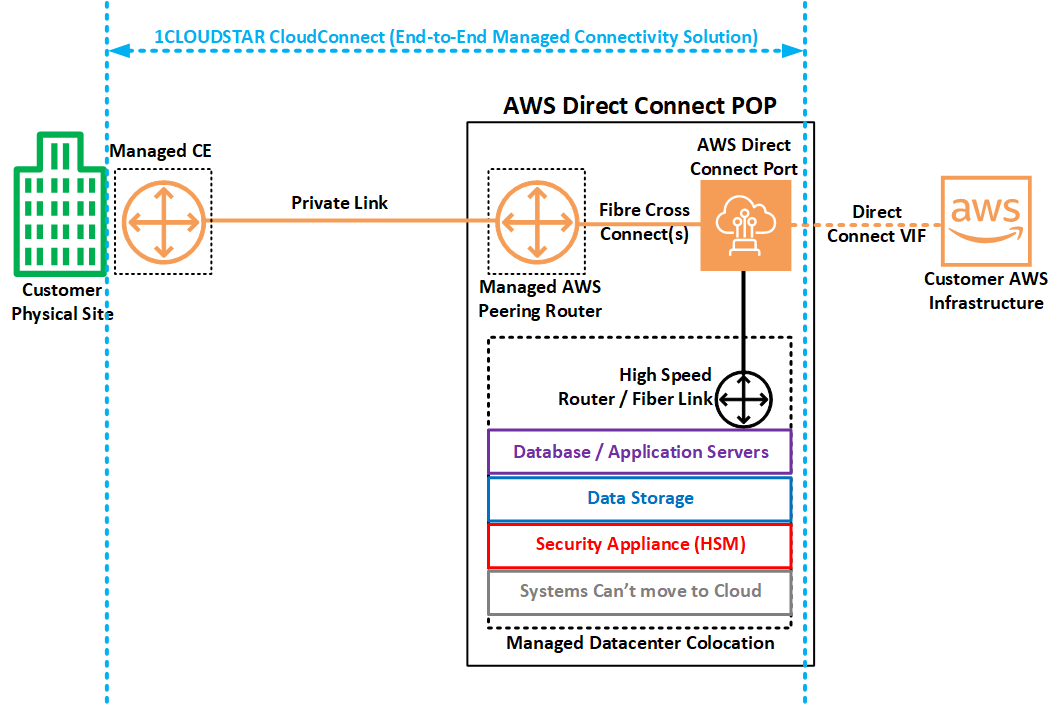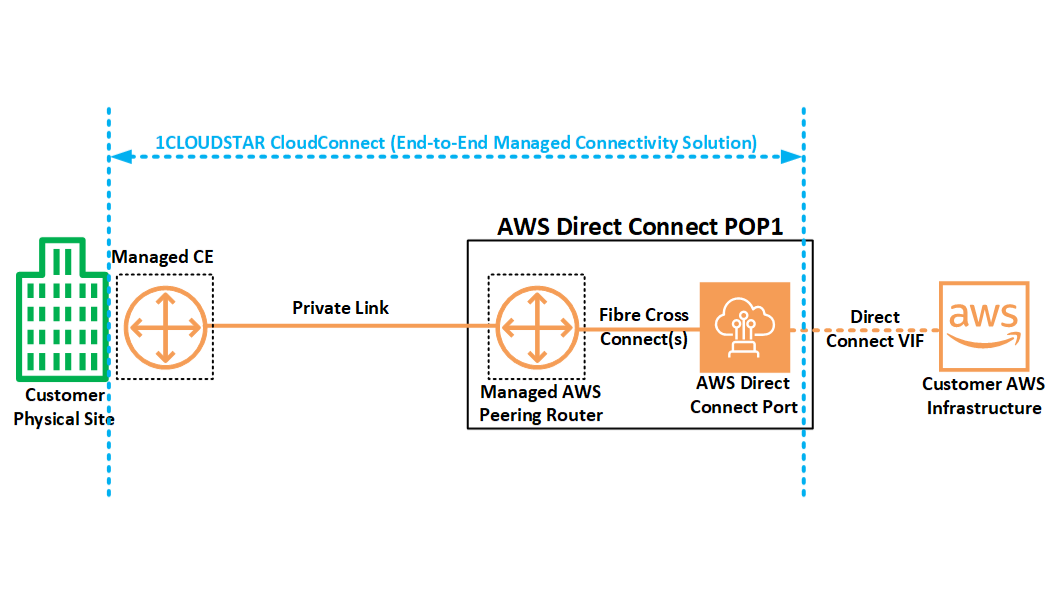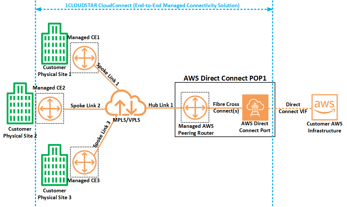 AWS Direct Connect is a native AWS Service that enables you to establish a dedicated private network connection from designated AWS Direct Connect point-of- presence (POP) to AWS. It provides increased bandwidth throughput, more consistent network pertormance, higher security and reduced overall cost (i.e. using Direct Connect to transfer huge amount of data between on-premises systems and AWS can yield significant cost benefits.) than the Internet-Based connection options; and can scale up to as high as 10Gbps or multiple of 10Gbps bandwidth. 1CLOUDSTAR’s CloudConnect Service for AWS is an enterprise-grade solution that seamless integrates AWS’s Direct Connect service with other key ingredients, such as domestic or international private circuits, datacentre colocations service, managed routers / firewalls, and 24×7 around the clock monitoring and support, and provides our customers a truly end-to-end one-stop managed solution to connect any number of its physical sites (such as offices, production facilities, and datacentres) to AWS with any preferred network throughput (from 10mbps up to 10Gbps), resiliency, network topology (i.e. point-to-point, multipoint etc.) and underlying connectivity technologies (i.e. layer 2, layer 3, MPLS, SDWAN etc.) By working with 1CLOUDSTAR, you will be working with one of the pioneer AWS Direct Connect partners in Singapore with years of experience behind the team. With our broad range of customers in many different industries and sectors like FSI, government, education, aviation, transportation, logistics, manufacturing, property, retail and e-commerce, our team can always deliver a connectivity solution that is customized tailored to meet your Cloud Connectivity needs and budget.